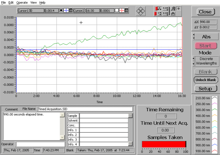 The Kinetics option allows for real time data acquisition, growth and decay analysis for up to ten wavelengths.